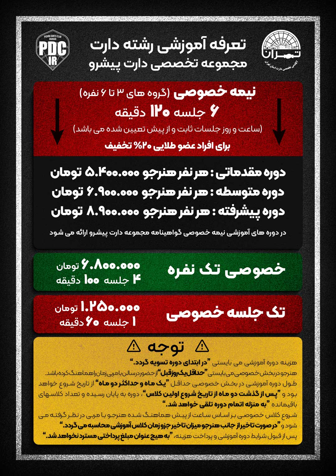 اگر برای رشد خود در دارت اهمیت قائل هستید، با اعتماد به ما و شرکت در دوره‌های آموزشی استثنایی ما، به اهداف خود در دارت نزدیک‌تر خواهید شد. در دوره‌های نیمه خصوصی ما، شما فرصتی برای تمرین و بهبود شرایط دارتی خود خواهید داشت و با افراد دیگری که به دارت علاقه‌مند هستند، در ارتباط و تمرین خواهید بود. همچنین، از تجربیات و نکات علمی مربیان ما در طول دوره بهره‌مند خواهید شد. شرکت در این دوره‌های آموزشی، به شما این امکان را می‌دهد که به طور قابل توجهی در مسیر رشد و پیشرفت قرار بگیرید. با توجه به محتوای آموزشی و راهنمایی‌های ما، شما می‌توانید بهبود چشمگیری در عملکرد خود در دارت داشته باشید.